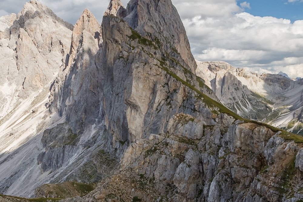 Seceda la belle montagne et le domaine de ski et de randonnée situé dans les Dolomites au Tyrol du Sud. Une très belle vue lorsque vous marchez ici sur l'herbe joliment tondue de la piste de ski.