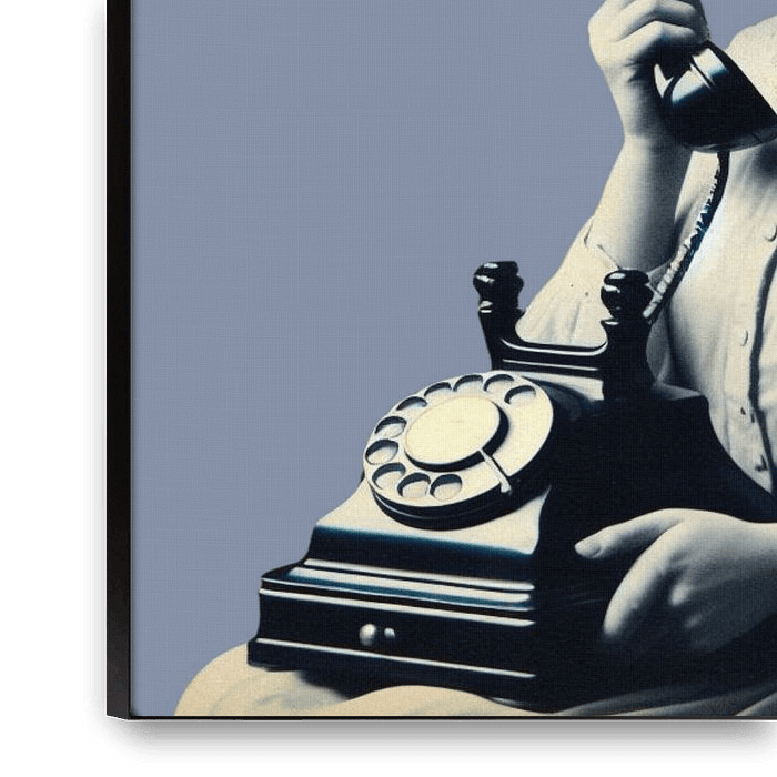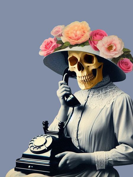 Une silhouette squelettique assise à un bureau, tenant un téléphone, dans un décor de bureau rétro. L'œuvre reflète avec humour les thèmes intemporels de la culture du travail tout en conservant un équilibre visuel raffiné.