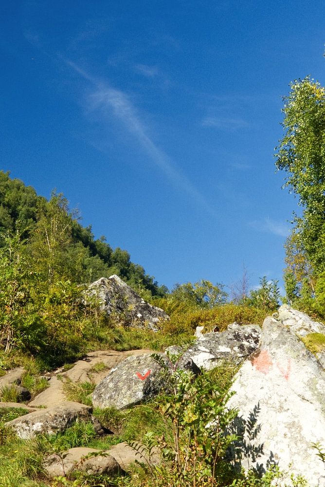 Sentier de randonnée balisé dans les montagnes jusqu'à l'alpage Homlongsætra au Geirangerfjord