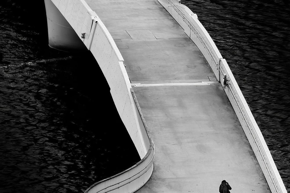 Laissez-vous toucher par l'émotion profonde de "Separation", une magnifique photographie minimaliste en noir et blanc qui transmet le message puissant de la connexion et du lâcher-prise. Cette photographie touchante montre deux personnes marchant séparément sur un pont dans la ville pittoresque de Mandal, en Norvège.