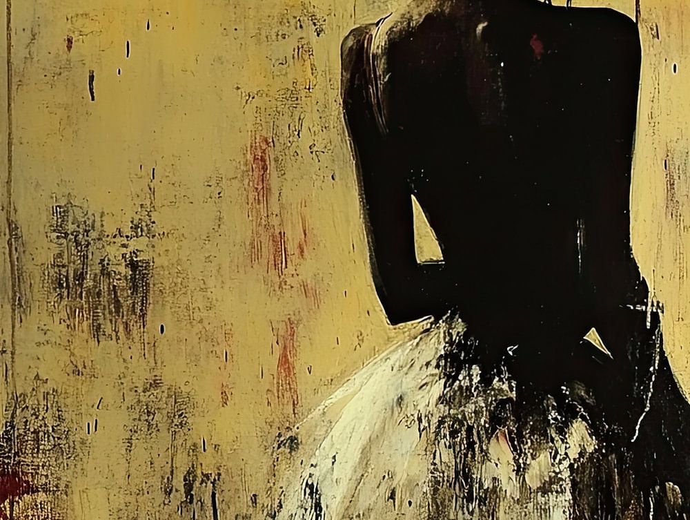 Elegant Silence - Ce tableau de femme représente une femme élégante et mystérieuse vue de dos, vêtue d'une somptueuse robe blanche sur un fond expressif et abstrait d'ocre et de rouge profond.