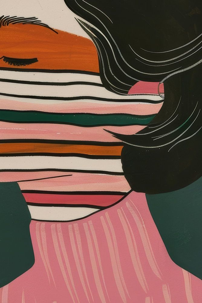 Cette œuvre intrigante montre le visage serein d'une femme, vue de profil, les yeux fermés, comme si elle était dans un profond état d'introspection. Ce qui rend ce portrait unique, ce sont les lignes horizontales colorées qui traversent son visage et son cou, donnant à l'image un aspect stratifié, presque abstrait. Ces lignes symbolisent les différentes couches d'identité, d'émotions et d'expériences qui nous façonnent, mais qui restent souvent cachées sous la surface.