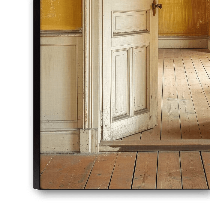 Silent Passage - no. 03" montre un intérieur jaune ocre qui porte visiblement les traces du temps : altération, patine, craquelé subtil, comme des témoins silencieux de vies passées et d'histoires plus longues. Les portes à panneaux classiques, le sol en bois clair et les murs légèrement écaillés se combinent pour créer une composition qui n'est pas seulement esthétique, mais aussi stratifiée. C'est un espace qui n'est pas poli, mais qui montre plutôt son histoire. C'est ce qui fait la particularité de cette œuvre dans la série Silent Passage : ici, il n'y a pas seulement du silence, mais aussi de la mémoire.