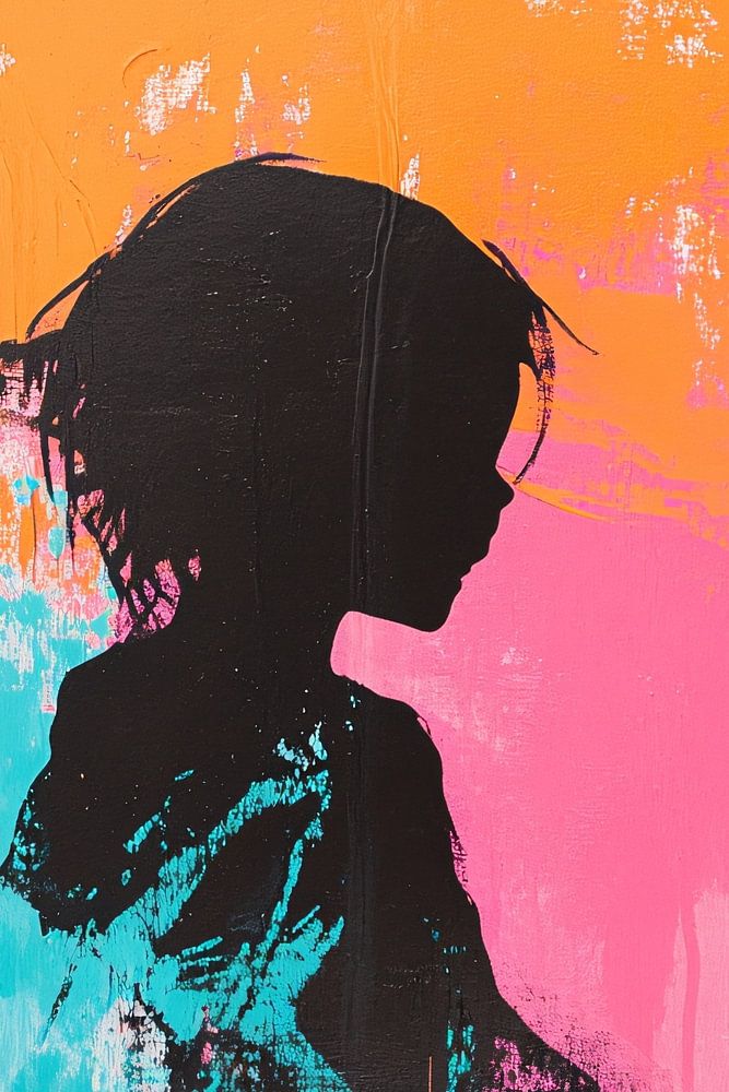 Cette œuvre d'art unique combine un style de silhouette moderne avec des couleurs vibrantes et des formes abstraites. Les contrastes frappants entre le noir et les tons vifs d'orange, de rose et de bleu créent un effet visuel dynamique et puissant. Idéal pour les amateurs d'art moderne et parfait pour embellir un intérieur au style contemporain. Ce tableau peut attirer le regard dans un espace de vie ou de travail, apportant une touche de créativité et d'énergie à n'importe quel environnement.