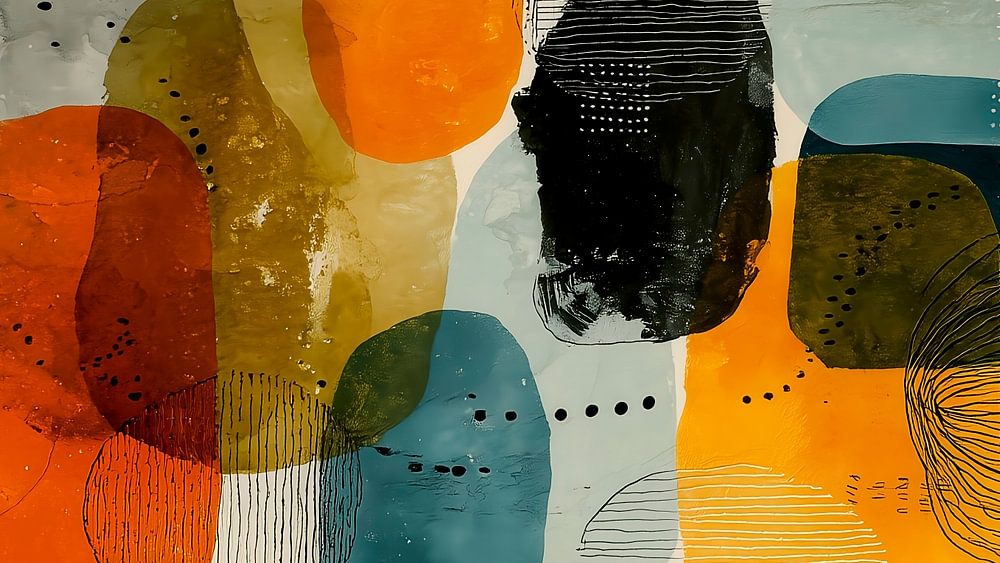 Une œuvre d'art abstraite avec des formes organiques superposées dans différentes nuances. Des lignes et des motifs décoratifs subtils, notamment des points et de fines lignes sinueuses, ajoutent des détails à l'impact visuel global. Les couleurs se mélangent et se superposent, créant une impression de profondeur et de dimension dans l'espace bidimensionnel. L'œuvre d'art est moderne, presque minimaliste, et met l'accent sur la forme et la couleur. Une palette de couleurs sourdes crée une atmosphère calme et sereine. Le style de l'œuvre peut être décrit comme abstrait, artistique et visuellement attrayant.