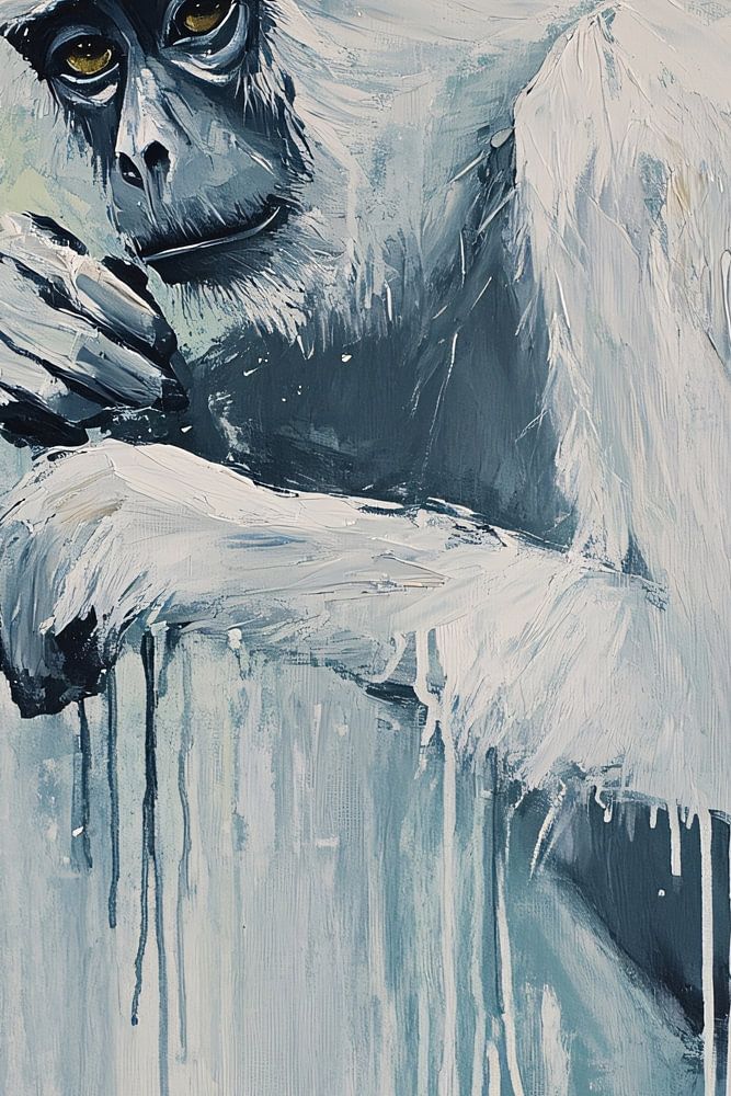 Ce tableau saisissant représente un singe contemplatif, subtilement représenté dans de douces nuances de blanc, de gris et de bleu. La peinture semble couler le long de la toile, donnant un effet dynamique intriguant à l'œuvre d'art. Le dessin a un style expressionniste et joue avec les textures et les contrastes, ce qui en fait un choix parfait pour les intérieurs modernes. L'apparence sereine et réfléchie du singe attire le regard et donne un sentiment de calme, tandis que l'utilisation monochrome de la couleur maintient un look moderne. Cette œuvre d'art s'intègre parfaitement dans un espace épuré et minimaliste tel qu'un bureau ou un salon, où elle peut servir de sujet de conversation.