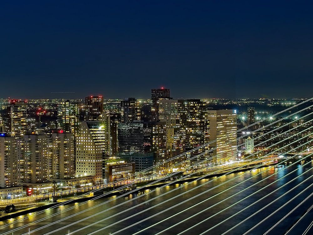 Cette photo a été prise depuis une hauteur d'environ 130 mètres, au sommet d'un immeuble de bureaux situé dans le quartier Kop van Zuid, par une soirée où le ciel était dégagé. À nos yeux, il fait déjà nuit noire, mais le ciel est coloré par la lumière encore présente et l'éclairage de la ville.