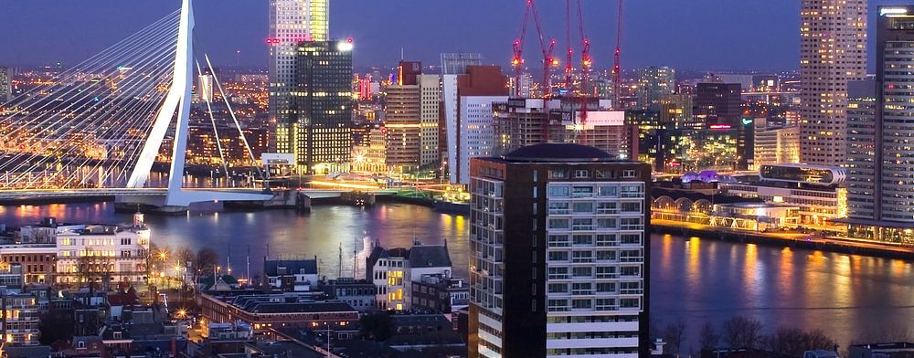 Une photo de Rotterdam au coucher du soleil, prise de l'Euromast.