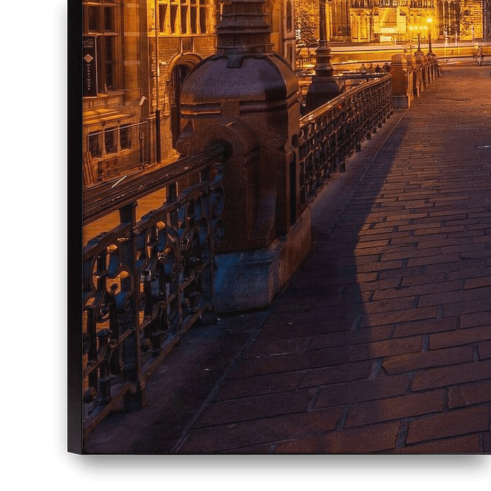 Vue du pont Saint-Michel vers le Korenmarkt à Gand, Belgique. Photographiée le soir, juste après le coucher du soleil.