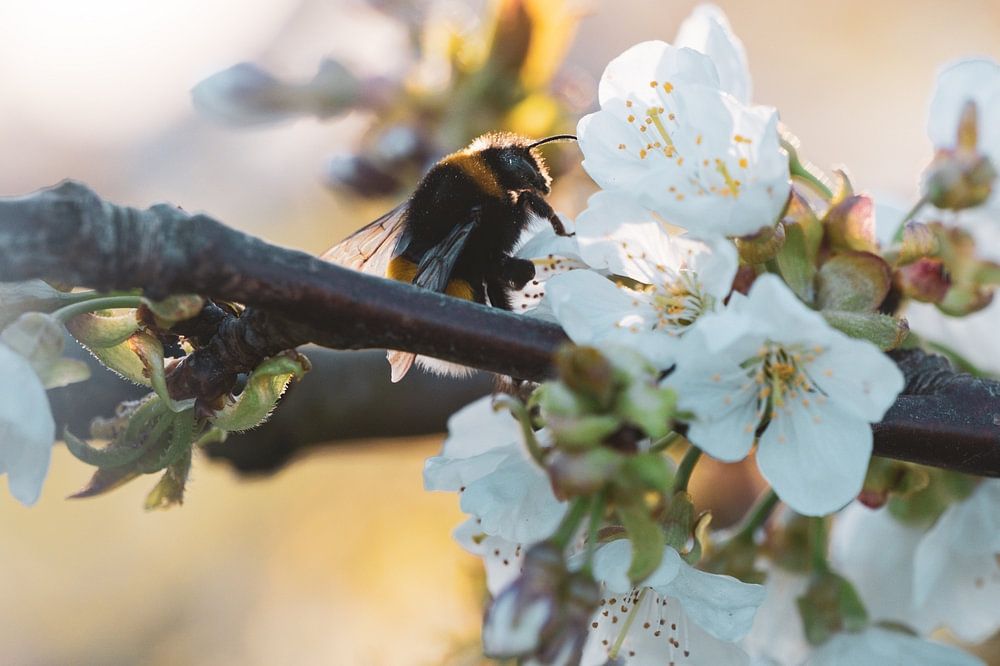 La photo montre les fleurs de cerisier à l'heure dorée du soir en compagnie d'un bourdon.