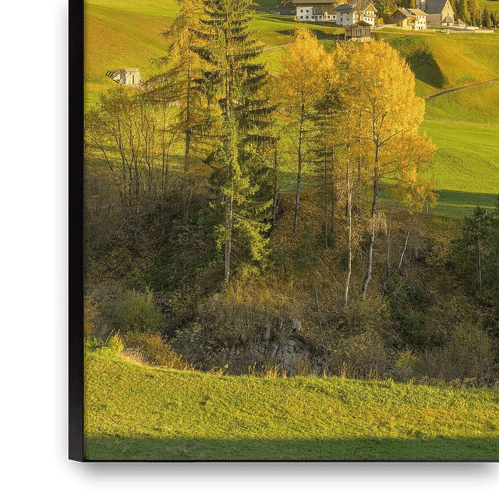 Le soleil de fin d'après-midi baigne dans une lumière chaude le paysage pittoresque de la vallée de Villnösstal. En arrière-plan, vous pouvez voir les pics Geisler, qui comptent parmi les montagnes les plus célèbres des Dolomites.