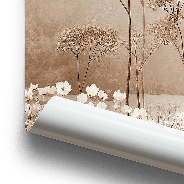 Le paysage est parsemé d'arbres bruns et fins. Leurs formes élancées donnent du rythme sans rompre la sérénité. Au premier plan, des fleurs blanches s'épanouissent, légères et fragiles, portées par des tiges délicates de couleur brune et émeraude. Elles apportent une vibration subtile, comme de petits moments d'attention dans le calme.