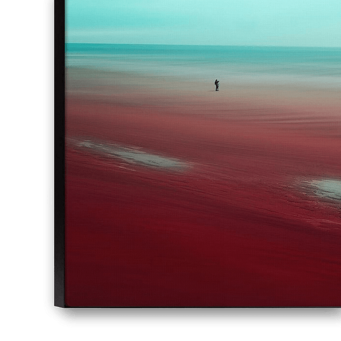 Un personnage solitaire se tient sur une vaste plage sous un ciel aux nuages dynamiques qui dérivent. Le mélange vif de tons rouges et bleus crée une atmosphère calme mais impressionnante.