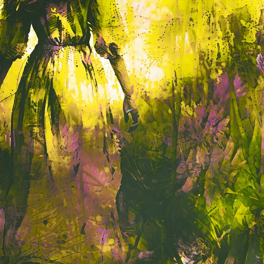 En sortant de la forêt d'été, on passe vraiment de l'ombre à la lumière éclatante du soleil d'été. C'est ce que fait cette jeune femme. Elle porte un chapeau pour protéger sa peau du soleil, et peut-être qu'elle aime cela. Sa robe est longue et pimpante, une robe d'été d'antan. À l'orée de la forêt, d'où elle émerge, il fait sombre, les arbres projetant leurs ombres loin devant eux. Il y a encore un peu de lumière chaude, mais pas grand-chose. Il y a beaucoup de fleurs, surtout du trèfle et, bien sûr, de l'herbe. Le trèfle blanc et le trèfle violet sont clairement visibles ici. L'endroit où elle va laisse cette œuvre au milieu. Mais où va-t-on par une telle journée d'été ensoleillée et chaude, peut-être pour aller chercher une glace, qui sait ? Les couleurs de cette œuvre picturale sont le vert, le jaune, le magenta et le blanc.