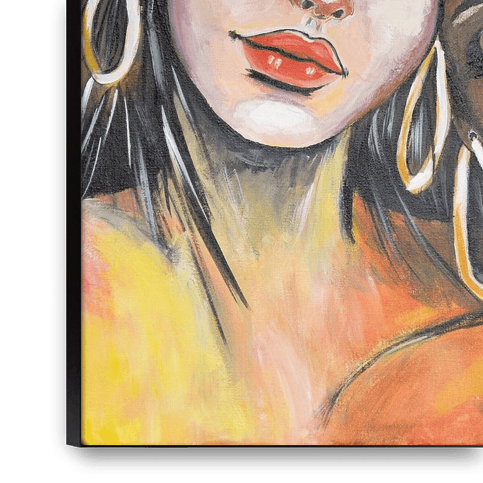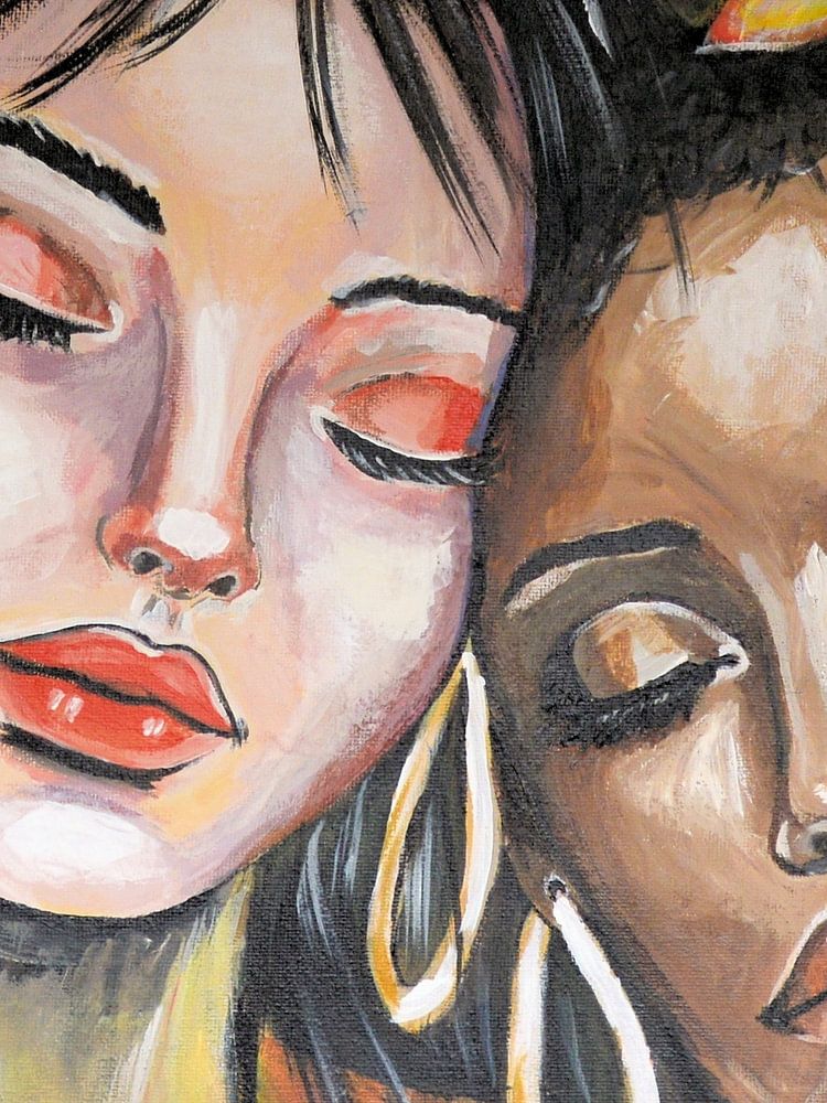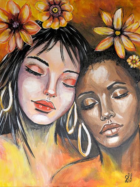 « Soulsisters » est une peinture acrylique chaleureuse et expressive mettant en scène deux portraits de femmes. Les yeux fermés, elles se blottissent tendrement l’une contre l’autre, évoquant un sentiment de paix, de confiance et de complicité. Les teintes chaudes – allant de l’ocre, de l’or et de la terre cuite à de délicates touches…