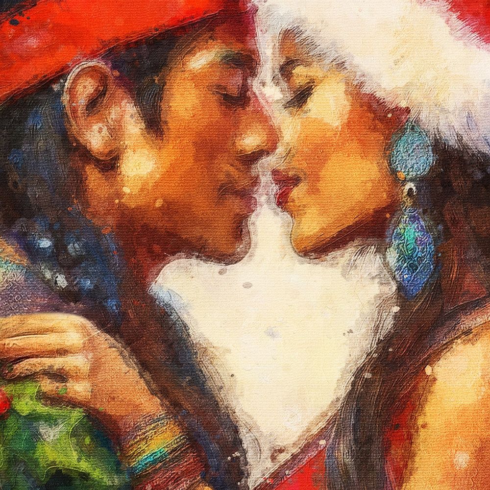 Peinture numérique d'un couple indien amoureux sous le gui à Noël.