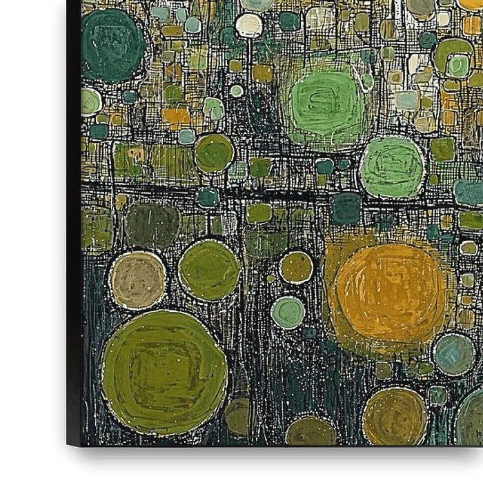 Cette peinture abstraite capture une scène naturelle enchanteresse dans une mosaïque de cercles et de carrés. Les teintes dorées du haut s'estompent pour laisser place à des verts plus profonds en bas, suggérant la lumière du soleil filtrant à travers le feuillage ou se reflétant sur l'eau. Les formes géométriques dansantes créent du…