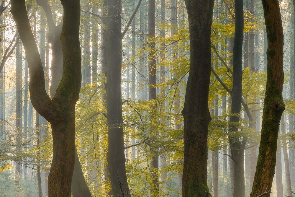 Un rayon de lumière perce dans le Speulderbos par un matin brumeux d'automne, avec des arbres aux formes caractéristiques