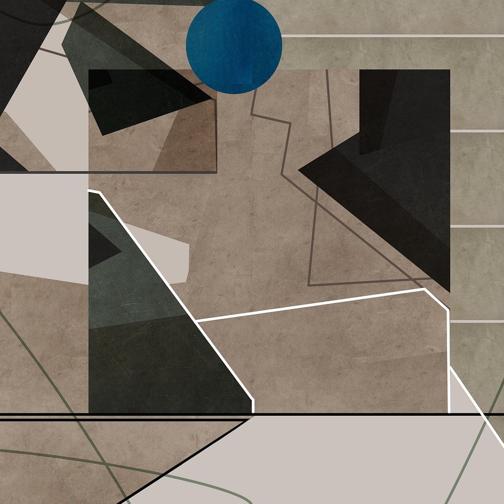 Cette composition abstraite complète parfaitement l'œuvre d'art minimaliste "Aha". Des couleurs neutres, des formes abstraites imbriquées et une fine ligne noire traversant l'image caractérisent cette œuvre.