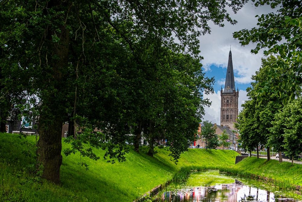 Vue de l'église de Steenwijk avec les douves au premier plan et les arbres le long des douves.