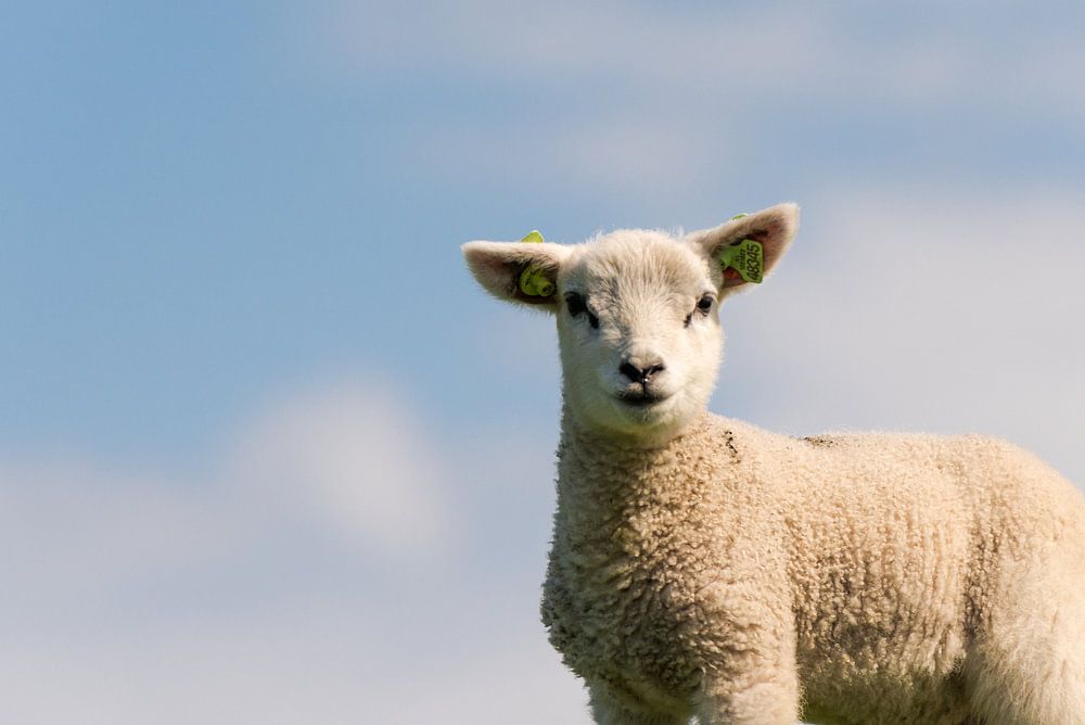 Stoer en nieuwsgierig kijkend lammetje op een dijk, in het gras, tegen een blauwe lucht met flarden van wolken.