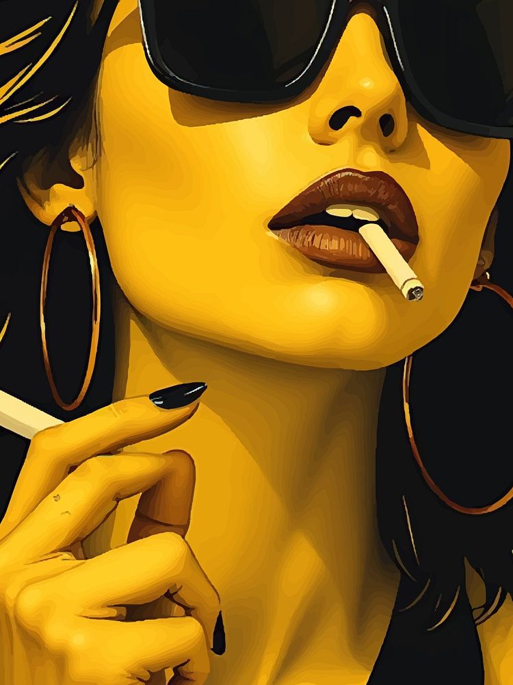 Portrait stylisé d'une femme aux cheveux noirs balayés par le vent, portant des lunettes de soleil et une cigarette, dégageant une aura froide et confiante.