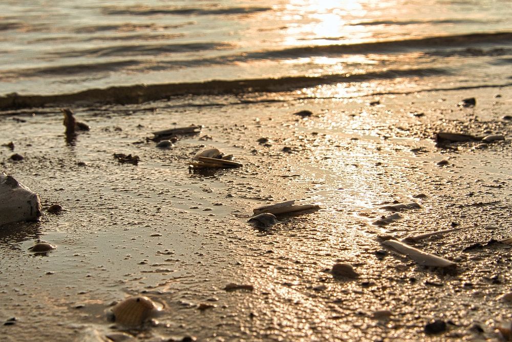 Sur la plage de Blåvand, au bord de la mer, sous le soleil. Coquillages au premier plan