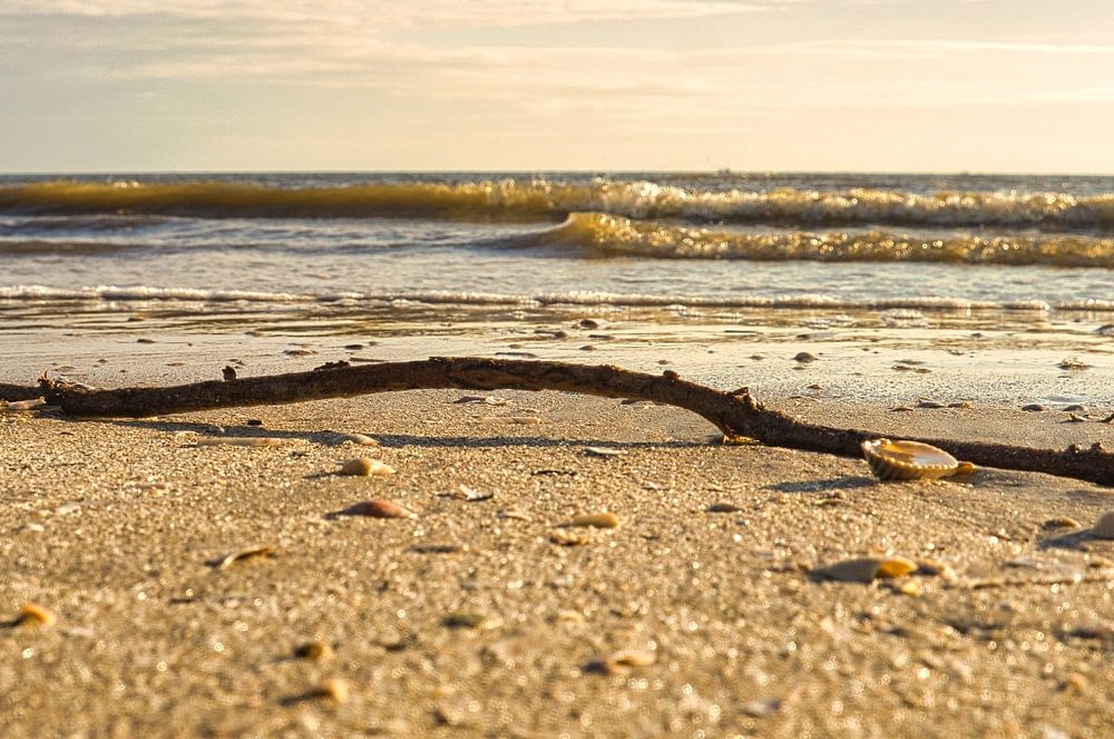 Sur la plage de Blåvand, au bord de la mer, sous le soleil. Branche au premier plan