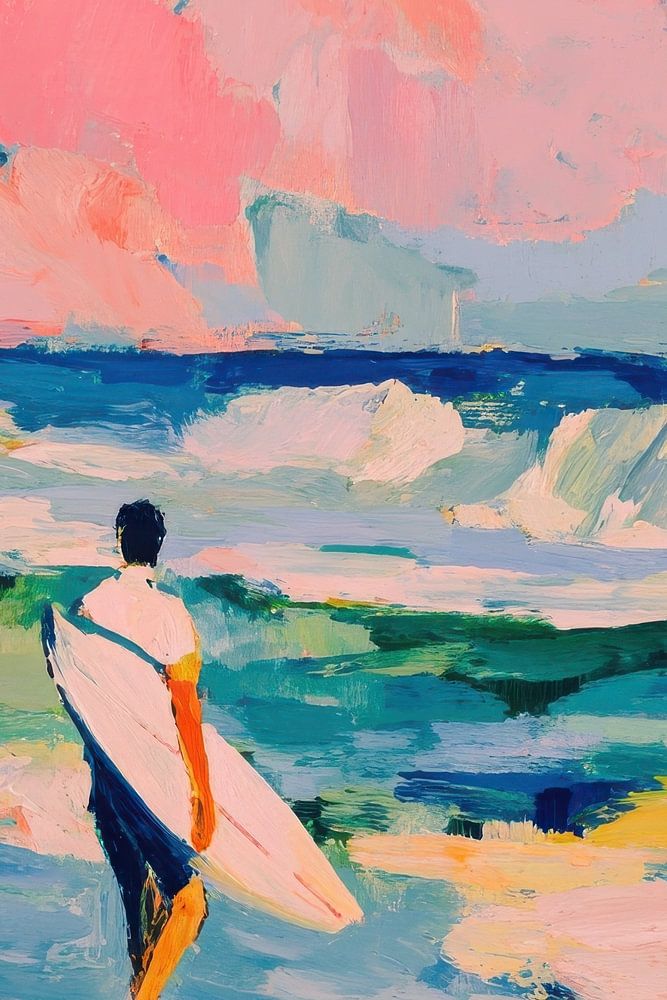 Un surfeur marche sur la plage avec sa planche de surf, entouré d'un ciel rose et bleu avec des nuages colorés. De douces vagues vertes déferlent en arrière-plan, tandis que les couleurs pastel rose, orange, jaune et turquoise confèrent à l'image une ambiance vivante et impressionniste. Des coups de pinceau visibles créent un mouvement et une texture qui capturent la liberté et la légèreté du moment. La composition harmonieuse associe la plage, la mer et le ciel pour créer une scène colorée et atmosphérique pleine de dynamisme et d'énergie estivale.