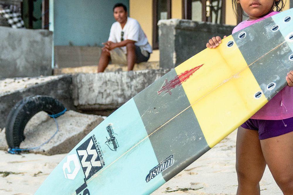 Meisje met surfplank op Balinees eiland, Nusa Lembongan