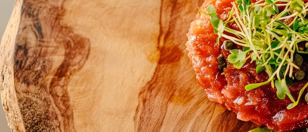 Un accroche-regard cool du monde culinaire, qui enthousiasme avec des ingrédients frais et colorés et un dressage artistique. La combinaison harmonieuse de viande rouge et de pousses croquantes sur une planche en bois rustique est une invitation au plaisir. Cette œuvre d'art trouve parfaitement sa place dans une cuisine au design moderne ou dans une salle à manger accueillante.