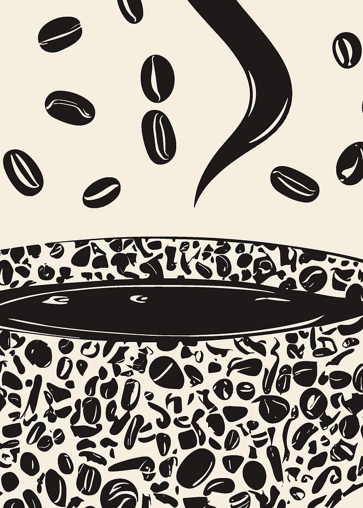 Cette image impressionnante montre une tasse de café stylisée, formée d'une multitude de grains de café, représentant une tasse de café chaud. Un nuage de vapeur s'élève au-dessus de la tasse, symbolisant l'odeur du café fraîchement préparé. Des grains de café isolés flottent autour de la tasse, ce qui donne au motif un aspect vivant et dynamique. Le contraste des éléments noirs sur le fond beige confère à l'image une élégance intemporelle et s'adresse particulièrement aux amateurs de motifs de café minimalistes et stylés.