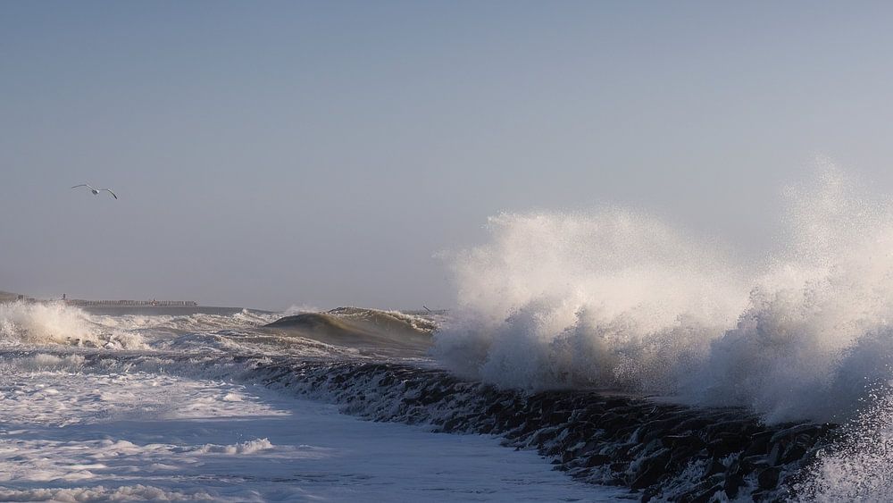 Une tempête déchaînée s'abat sur la plage "The Hole" à Westkapelle. Les puissantes vagues valsent sur la digue, mais la côte résiste à la force de la nature. Les mouettes s'envolent sur le courant d'air puissant.