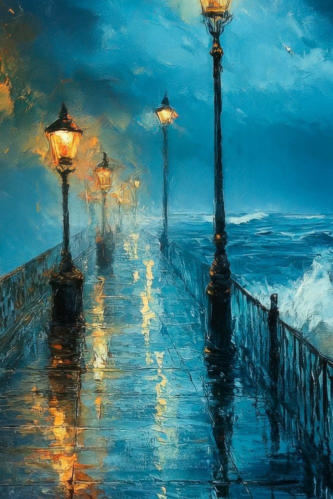 Un décor évocateur se déploie, où des lanternes dorées brillent faiblement dans un épais brouillard bleu. Le chemin asphalté brille comme un miroir tandis que des vagues impétueuses déferlent sur la jetée. La combinaison d'une lumière mystique et d'une mer en furie crée un sentiment de mélancolie et de tension qui fascine le spectateur.