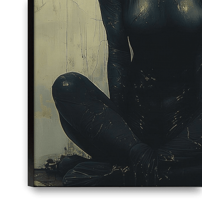 Divine Darkness" est une œuvre d'art puissante et intrigante qui fait la part belle au mystère et au symbolisme. La figure féminine, enveloppée dans une robe noire brillante, est assise dans une pose méditative, la tête levée, comme si elle s'ouvrait aux puissances supérieures. Le halo doré derrière sa tête confère une aura presque…