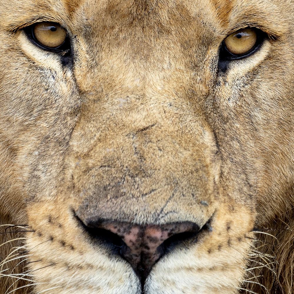 Tête d'un lion prise à bout portant dans le sud du Serengeti, en Tanzanie.
