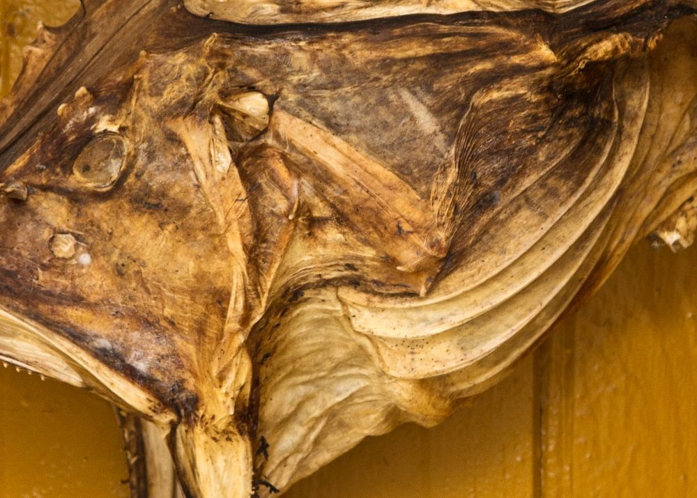 Tête de poisson séchée sur un mur en bois jaune à Nusfjord, dans les îles Lofoten, au nord de la Norvège.