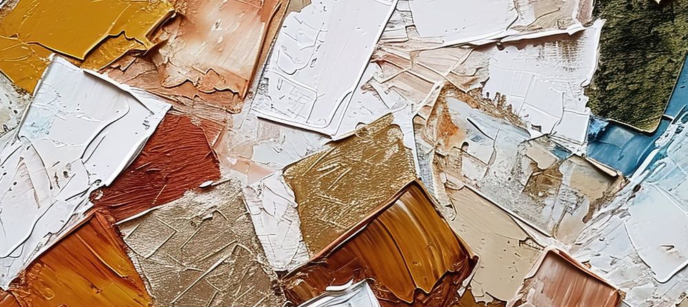 Détails : abstrait, moderne, texture, terre cuite, bleu, blanc, brun, or, énergie, mouvement, éclat chaud