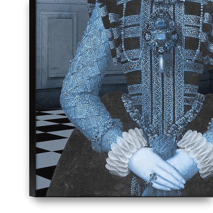 Travail surréaliste dans les tons bleus de Delft, dans le style des vieux maîtres. C'est un collage d'images diverses. Art avec un clin d'oeil ;-)
