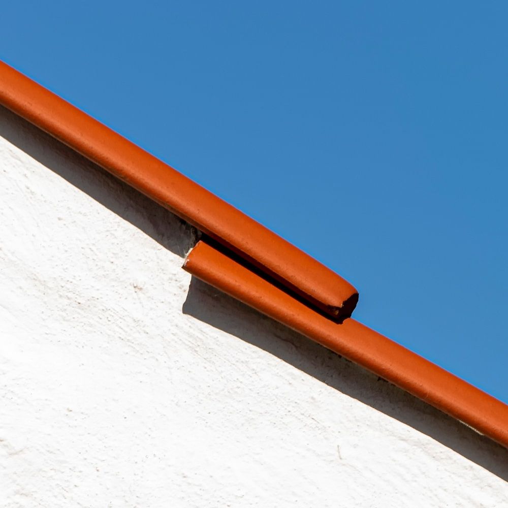 Gros plan d'un mur de maison blanc, de tuiles et d'un ciel bleu.