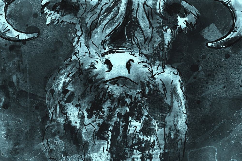 Une œuvre d'art cool d'un highlander écossais. Ce highlander vous regarde droit dans les yeux. Avec ses cornes pointées vers le bas, ce highlander écossais est une présence imposante. L'œuvre est peinte numériquement à partir d'un croquis dessiné à la main. Il s'agit d'une œuvre d'art à fort contraste en format paysage.
