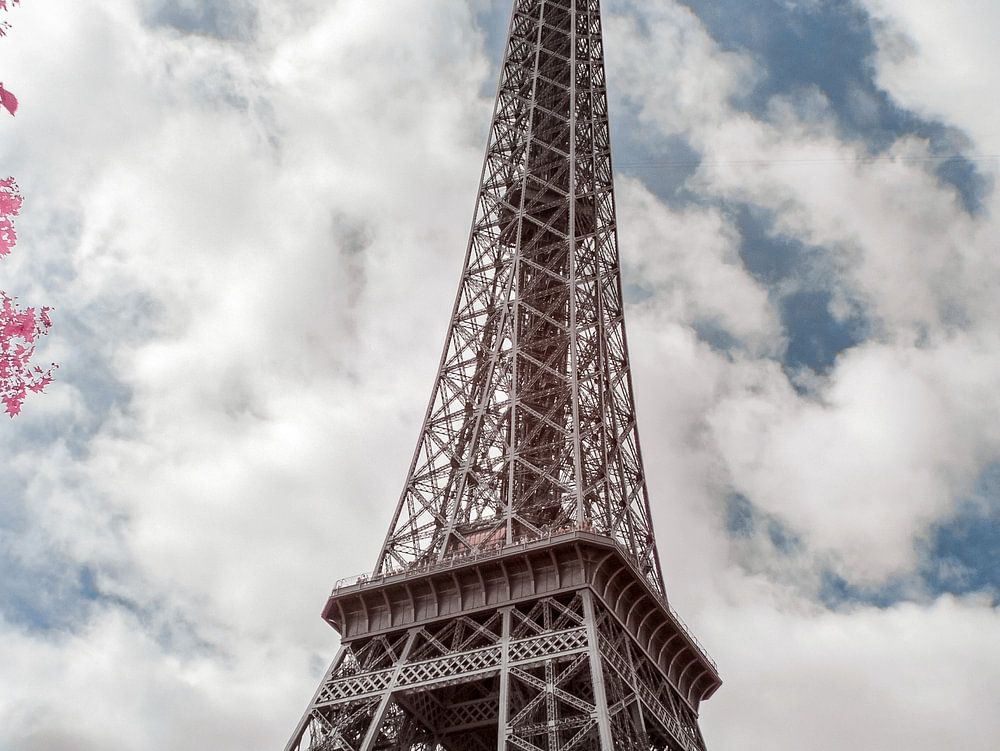 Photo prise en infrarouge de la tour Eiffel pendant les Jeux Olympiques de Paris 2024. Une petite vue à travers la canopée des arbres donne un joli cadre qui semble embrasser la tour.