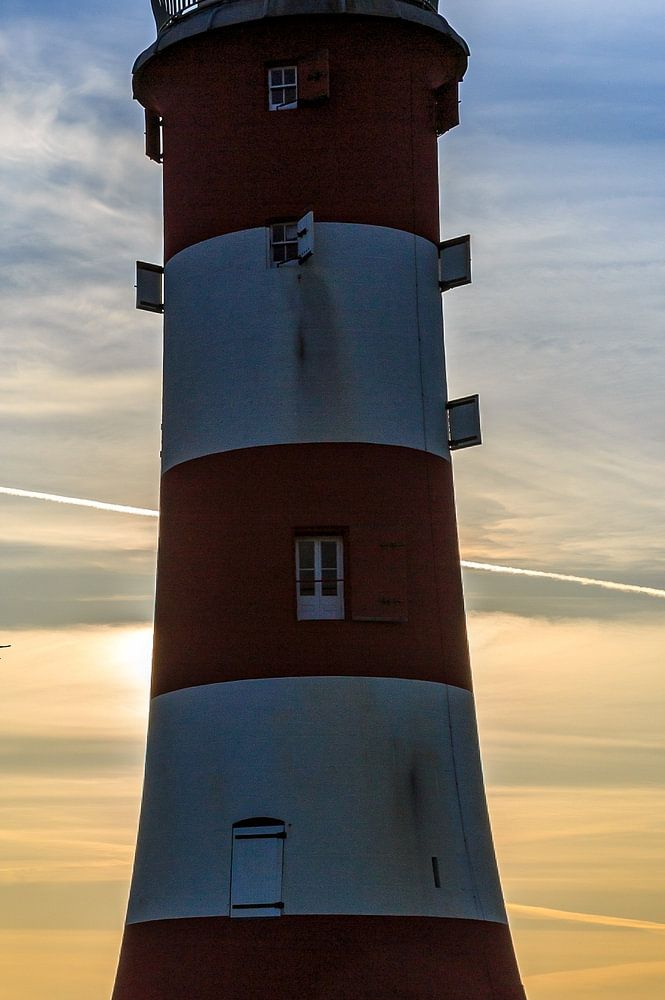 La tour rouge et blanche Smeaton's Tower (phare d'Eddystone) près de Plymouth, en Angleterre, projette une ombre sur la prairie tournée vers la côte, à contre-jour du soleil couchant. Deux mouettes se laissent porter par le vent en direction de la mer. Reconstruite en 1880, la Smeaton's Tower mesure environ 23 mètres de haut et offre, depuis sa salle des lanternes, une vue impressionnante sur le Plymouth Sound et la ville.