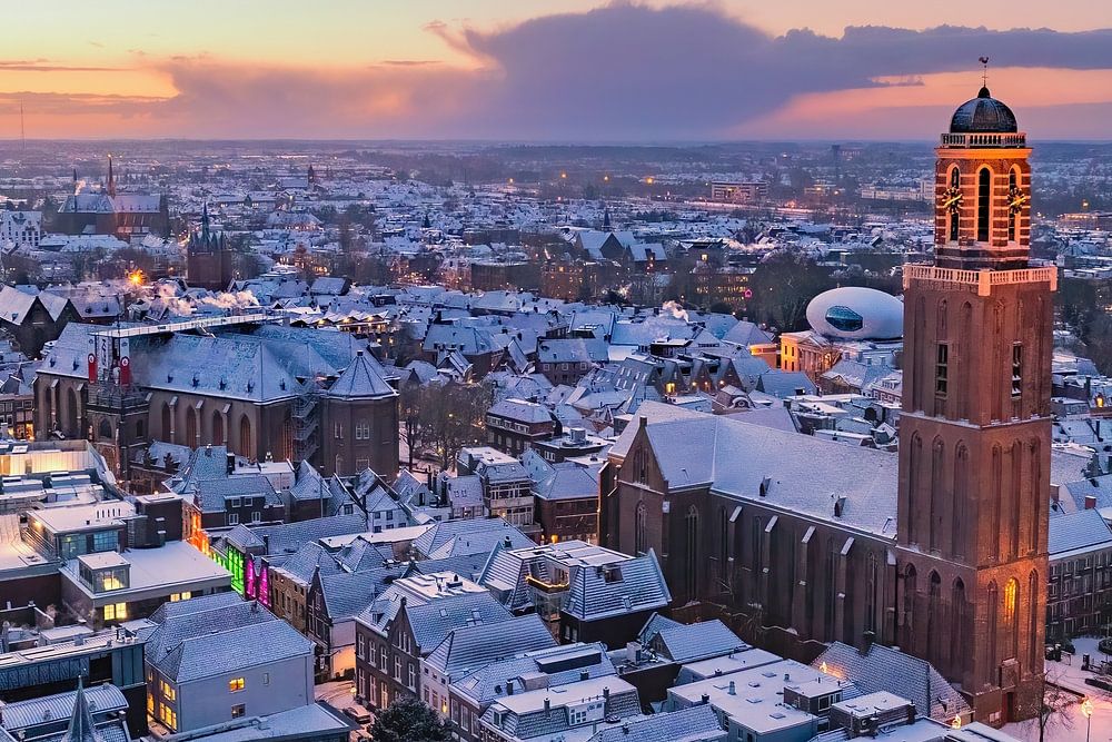 La tour Peperbus de l'église catholique romaine Onze Lieve Vrouwe ten Hemelopneming-basilica de Zwolle s'élève au-dessus des toits enneigés du centre-ville. Le clocher de l'église, appelé Peperbus (poivrière), est l'un des plus hauts et des plus célèbres des Pays-Bas.