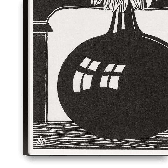 Nature morte avec une fleur dans un vase avec beaucoup de noir et le reflet de deux fenêtres dans le pot.