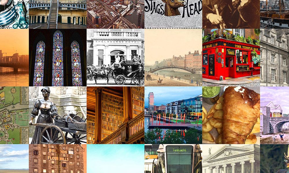 J'ai fait ce collage de toutes sortes de bâtiments typiques de Dublin, du pont Ha'penny, de photos, de bars, de plats et de culture. Vous y verrez le Trinity College, la Guinness, Molly Malone, Grand Canal Dock, Temple Bar, des musées, des quartiers et de vieilles photographies. Pouvez-vous les reconnaître et les nommer tous ?