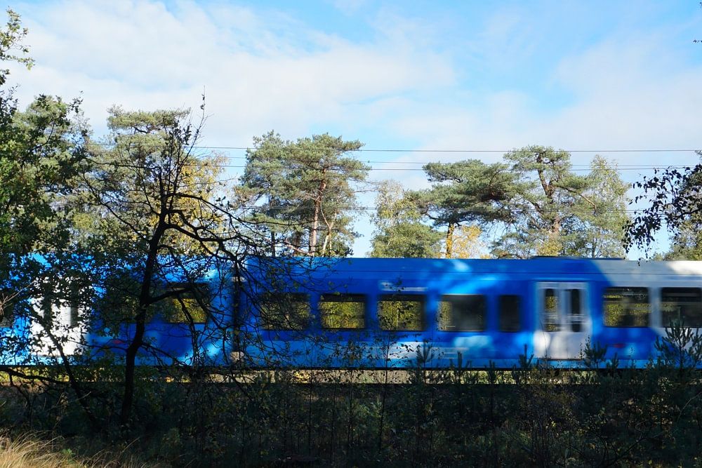 Train dans les bois près de Beerze (entre Zwolle et Hardenberg) sur fond de ciel bleu.