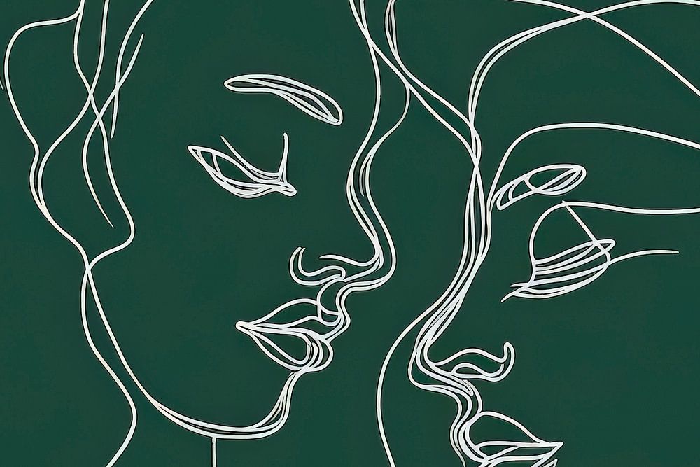 Deux visages doux se fondent dans un style de lignes minimaliste et élégant, niché dans un ton vert profond et apaisant. Les lignes courbes et l'échange intime des regards créent une atmosphère de complicité et d'attraction. Cette œuvre d'art convient parfaitement à une chambre à coucher ou à un salon moderne, où elle inspire le calme et le style.