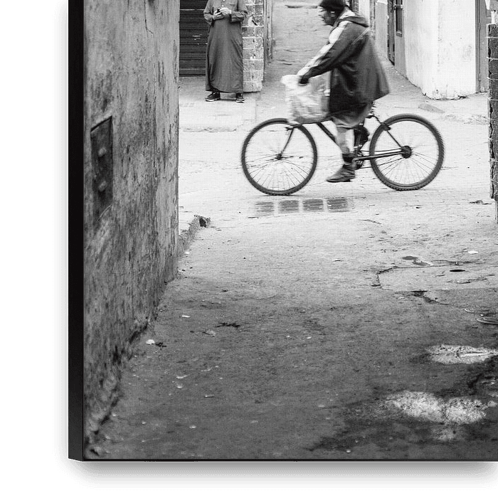 Photographie de rue dans le pittoresque village de pêcheurs d'Essaouira, au Maroc. Photo en noir et blanc d'un homme à vélo .