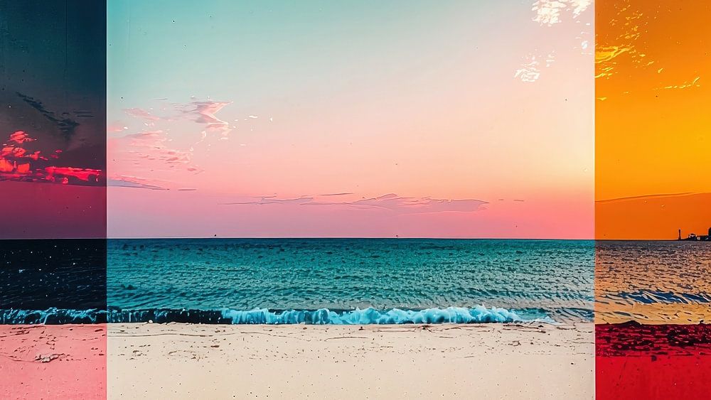 Cette œuvre montre la plage comme scène pour le changement de lumière et d'atmosphère. Trois segments verticaux de l'image présentent le même paysage côtier à différents moments de la journée : À gauche, des tons rouges et violets plongent la plage dans une ambiance nocturne, presque mystique. Le centre montre la lumière claire du jour avec un ciel bleu et du sable clair. À droite, des tons orange et jaune intenses transforment la scène en une image lumineuse du matin ou du soir.